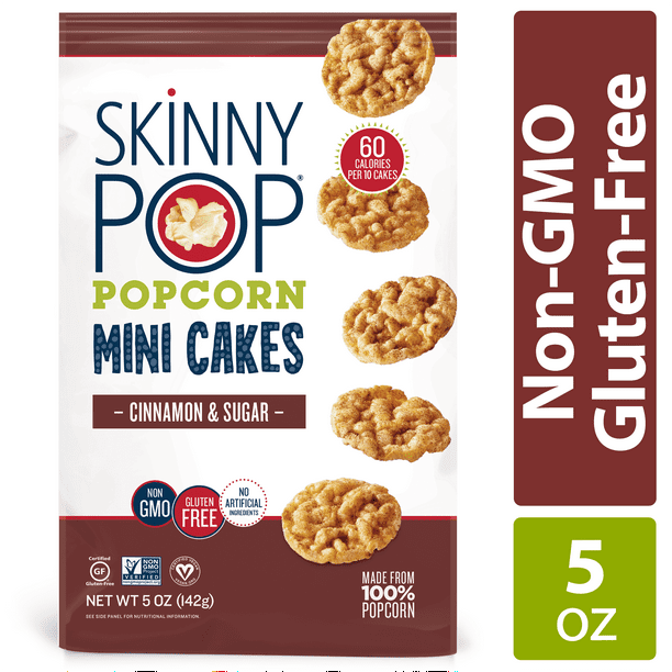 Mini popcorn cakes made with 100 SkinnyPop Popcorn and dairy-free sharp cheddar flavor. 20 cakes about 28g Calories. Up to 3 cash back Try Skinnypop Mini Cakes - Cinnamon Sugar.
